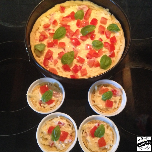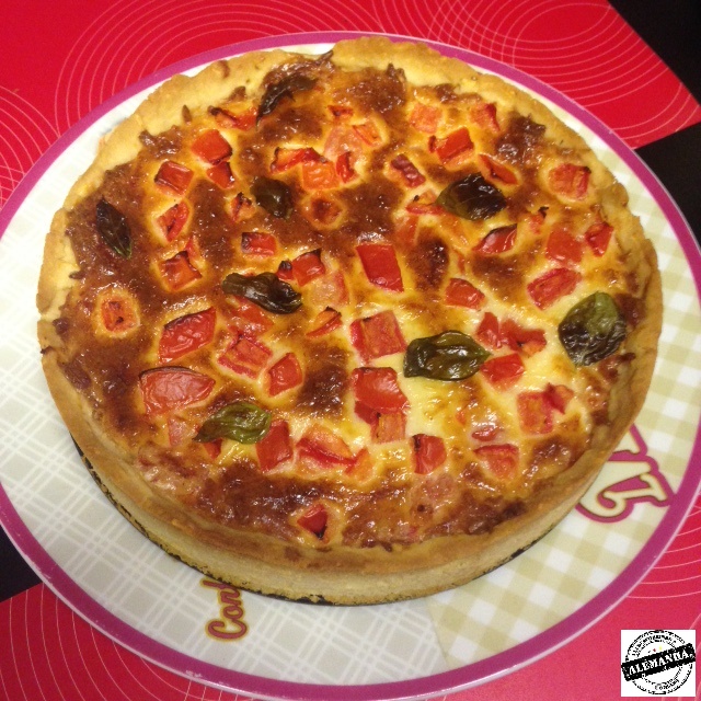 Fiz apenas algumas adaptações, pois o mercado que fui aqui em Aachen, não tinha os queijos pedidos. Usei queijo Emmental e Mozzarella. A torta ficou uma delícia, mas quem não gosta muito de queijo, pode achá-la enjoativa. Decorei com folhas frescas de manjericão.
