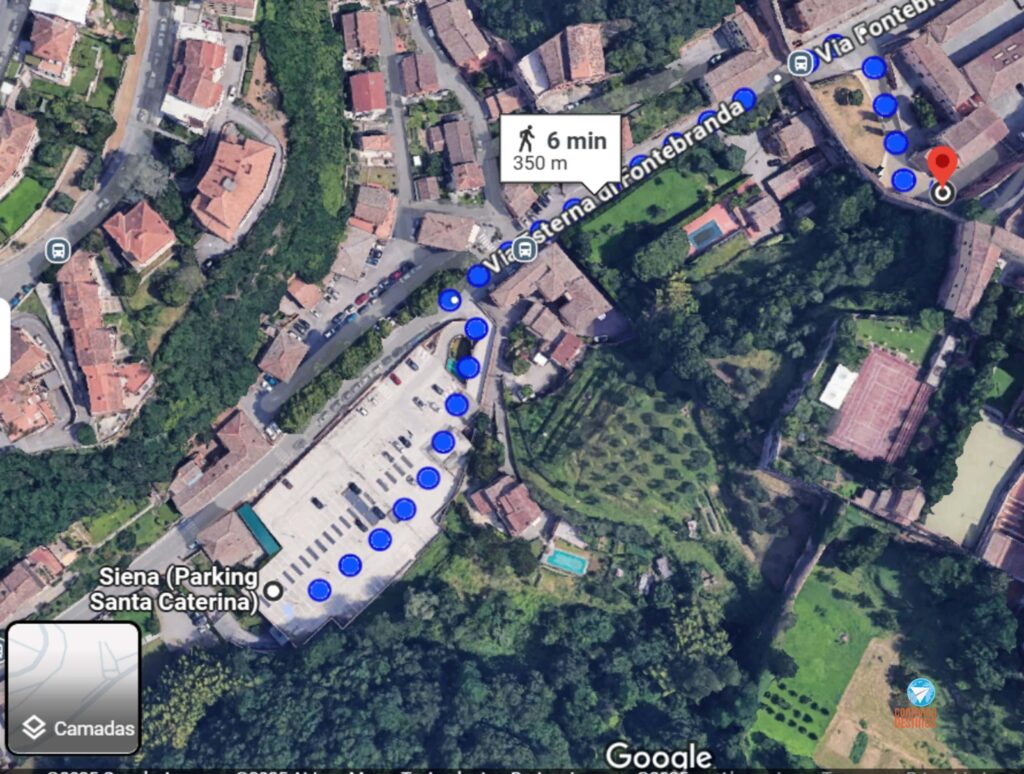 Há estacionamentos pagos na parte externa, e o que ficamos e aconselho é o Parcheggio Santa Caterina, ele fica perto de uma escada rolante que te levará diretamente ao centro de Siena.